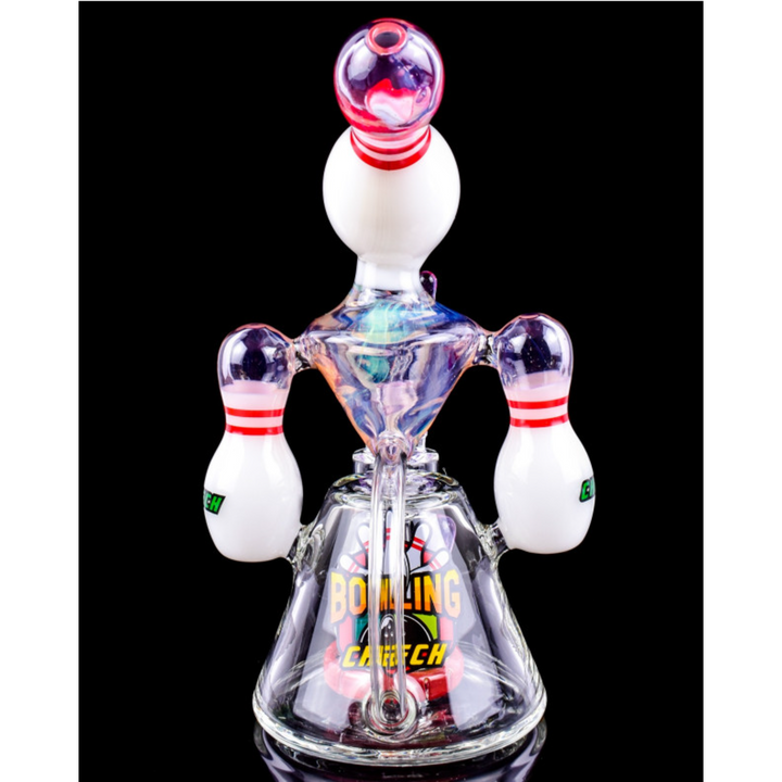 This piece features a built-in showerhead perc that delivers ultra-smooth, filtered hits with every inhale, while the recycler design keeps the water moving to cool and clean your smoke or vapor. The included 14mm dry herb bowl comes with a mini bowling pin striker attached—making this not just a rig, but a full-on statement piece.