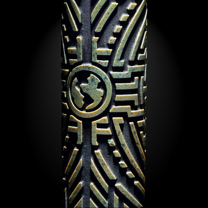 This 11″ mini beaker is colored glass layer with glass frit and sandblasted deep! It comes with a matching bowl and downstem.