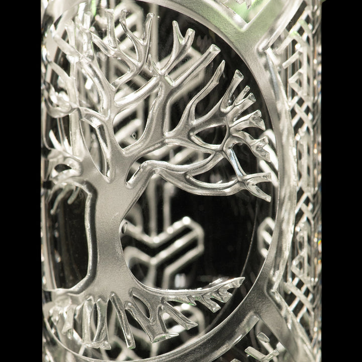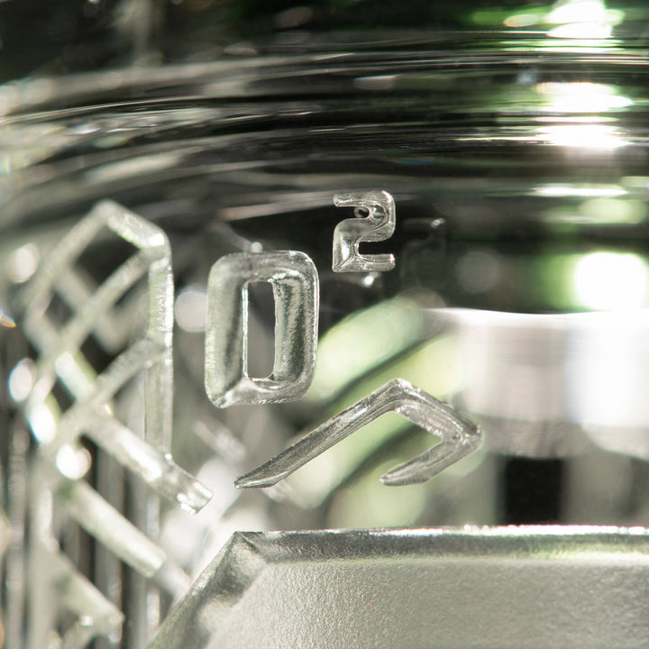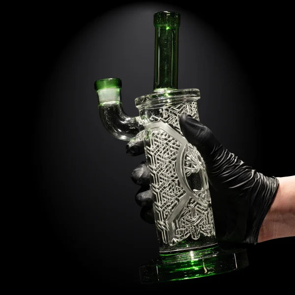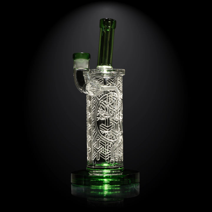 This piece is equipped with our advanced O2 technology and features a unique graphical waterway. This innovative design channels smoke between the glass walls, guiding it into the main chamber for percolation and filtration. This process not only cools down the smoke but also produces a mesmerizing visual effect as the smoke flows through the product. Adorning this piece is the “Tree of Life” graphic, distinguished by its incorporation of geometric shapes into the pattern.