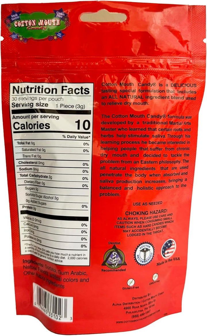 Cotton Mouth Candy's Fruit/Sour Mix is more than just a snack - it's a solution for dry mouth discomfort. The combination of fruity flavors and satisfying textures helps stimulate saliva production, providing relief from dry mouth symptoms. Whether you're looking for a quick way to alleviate dryness or a sweet/sour treat to enjoy during your favorite activities, Cotton Mouth Candy has got you covered.