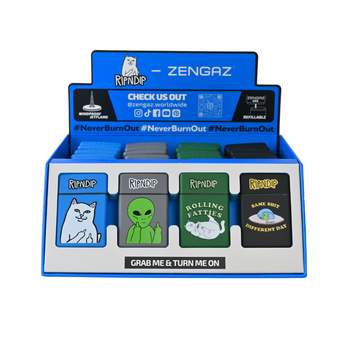 Light it up in style with the exclusive RIPNDIP x Zengaz collaboration. Merging Zengaz’s high-performance flame tech with RIPNDIP’s signature streetwear aesthetic, this limited-edition run of ZL-30 lighters brings the heat—literally and visually. With bold designs, reliable ignition, and a refillable build, these lighters are made to catch eyes and spark sales.